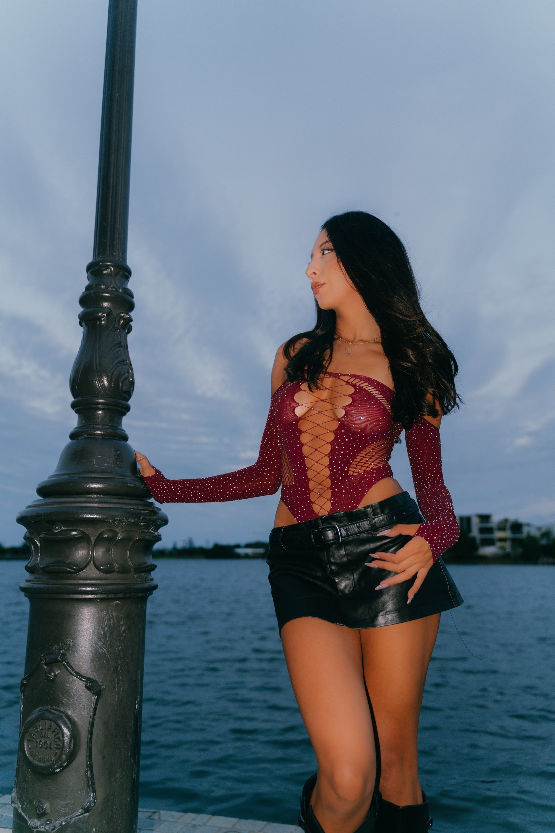 Make a bold statement with the Midnight Bodysuit Wine Red. This exquisite piece showcases dazzling rhinestone embellishments, a plunging lace-up neckline, and long, fitted sleeves, blending allure with sophistication. Its bodycon design accentuates your silhouette, perfect for glamorous evenings.